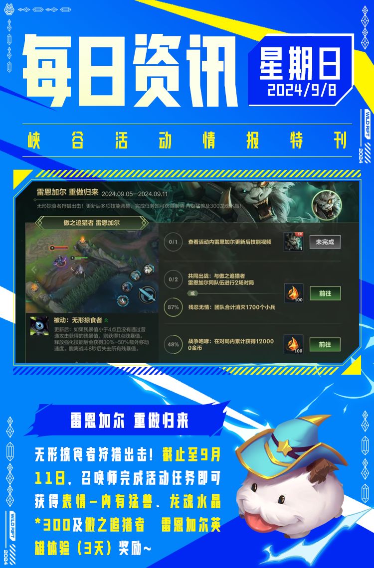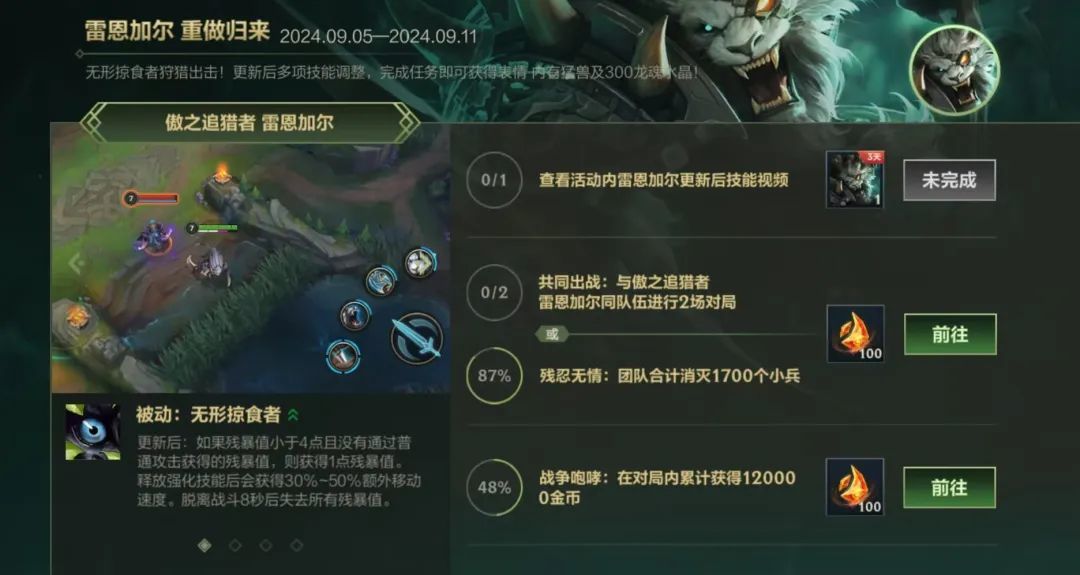 重做后的雷恩加尔多项技能调整更新,召唤师都体验了吗?截止至9月11日,召唤师完成活动任务即可获得表情-内有猛兽、龙魂水晶*300及傲之追猎者 雷恩加尔英雄体验(3天)奖励!