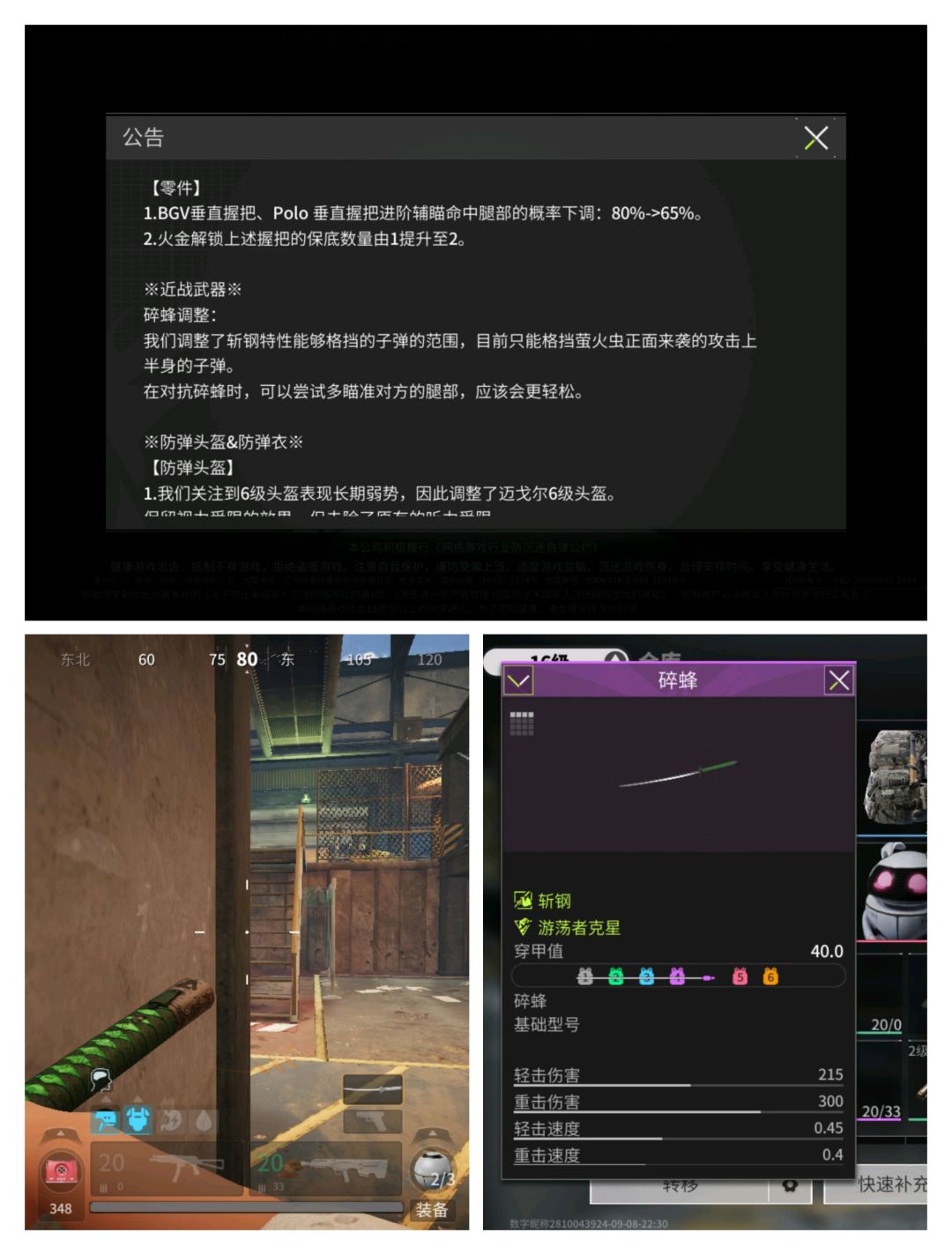 碎蜂在随风在这个版本明面上的削弱是不防腿,实际的削弱还有在对刀的情况下可以被振刀,体力消耗变多了等。