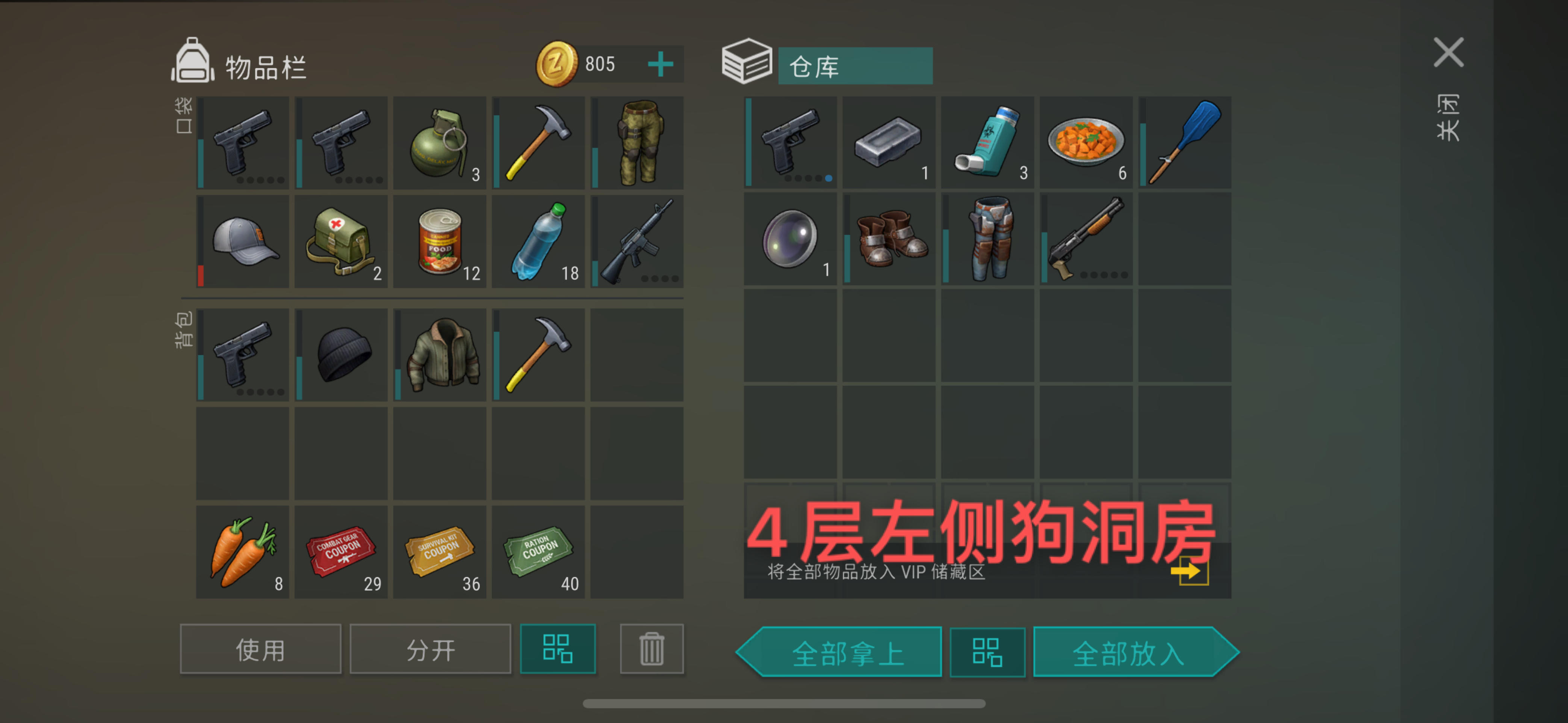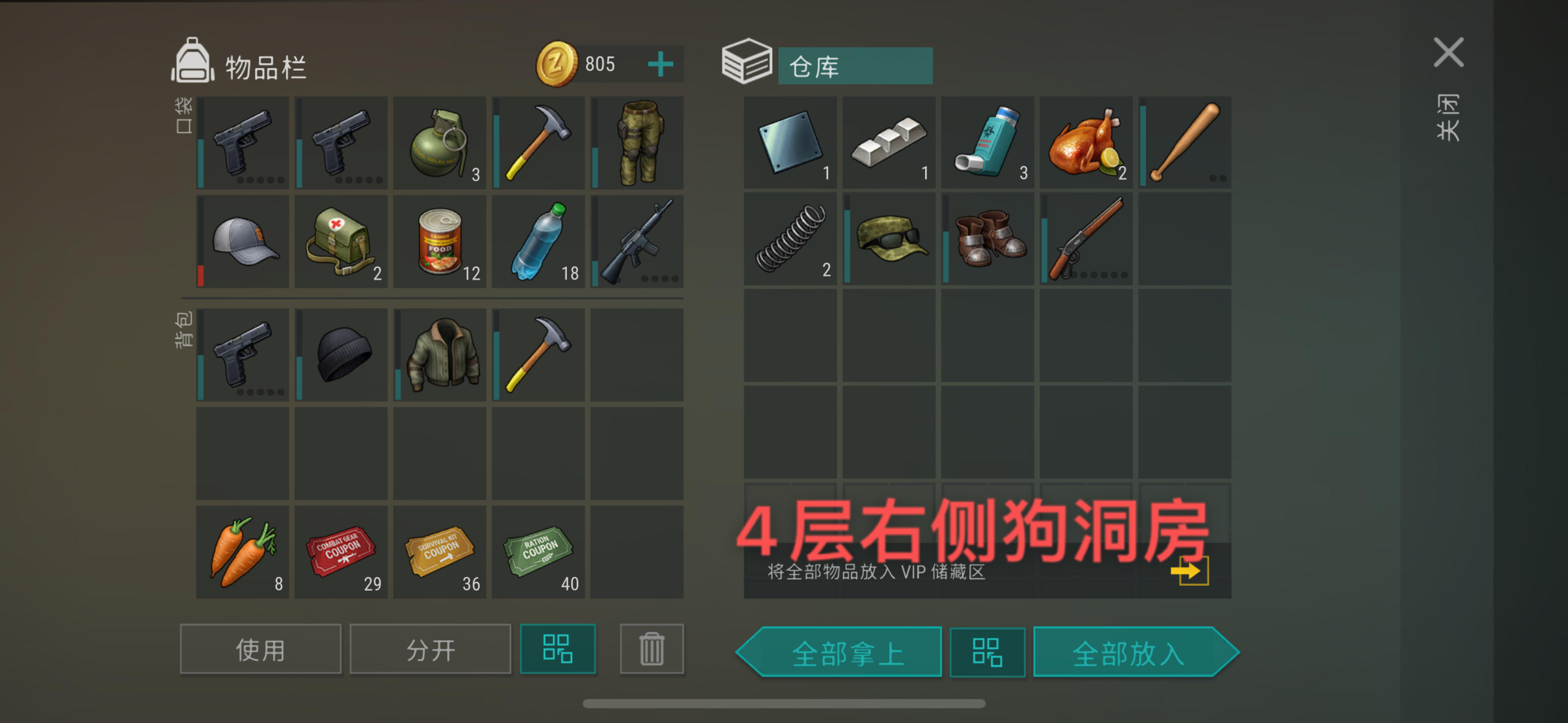 图3是A堡4层左侧(小炮塔房间)狗洞房产出的物资以上产出的物资都是随机的,但种类和大概数量基本固定:包括武器,衣服,药品,食物,铝材料,铁材料,铜材料,零件,喷漆...