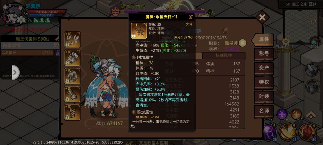 这种差距在整个50-60级阶段会普遍存在,战士55级无需更换装备,而法师则需要将武器换成55法杖世界树之枝,这件装备能叠加20层暴击率和法攻,相当于低配版的库科罗。因为暴击率给的没有库科罗大方,想利用到这20暴击率,必须把首饰也换成起源套装,额外多百分之七的暴击率,洗出来的属性也更高。牢温目前用的就是这个组合。一万一千三百法攻,单人50级大天使五分半,比起50级时确实有质的提升。但依然比不过战士,据我所知,库科罗战士打大天使最快是四分钟。