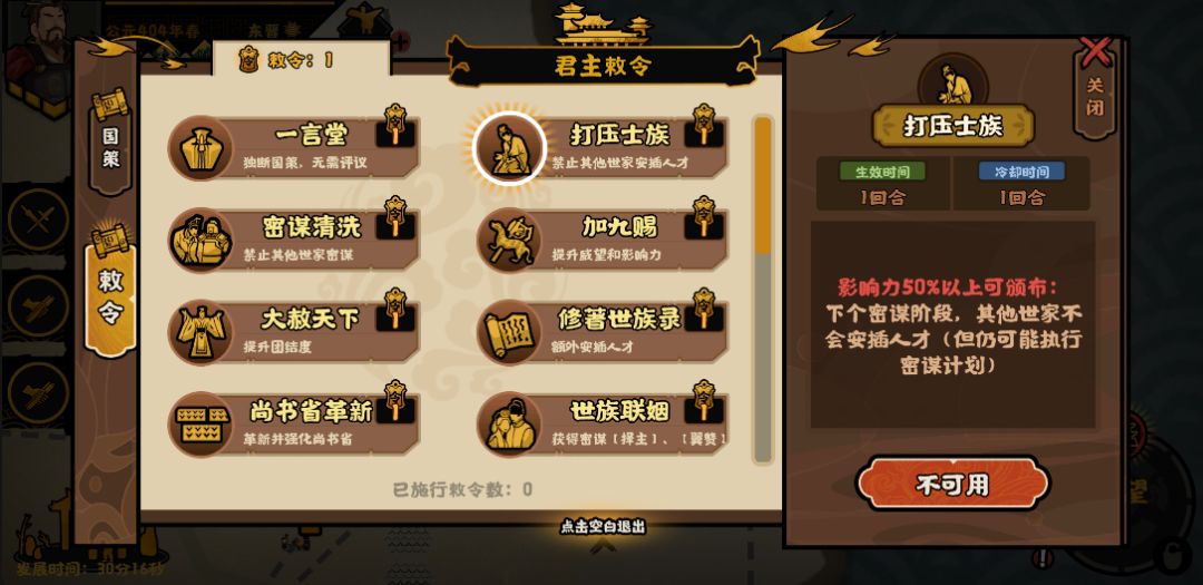 在 “刘裕北伐” 和 “太武建业” 的剧本中,会加入君主敕令的玩法。
