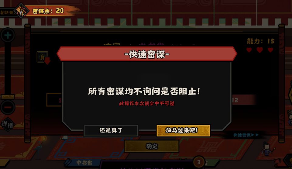 我们会增加快速密谋的功能,在我们不想管其他世家的密谋时,可以快速跳过其他世家密谋的阶段,继续自己的进程。