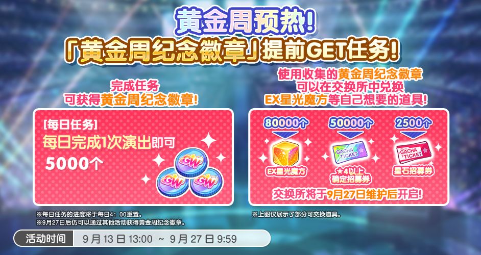 活动期间,在「每日任务」中完成演出达成任务即可获得特殊道具「黄金周纪念徽章」,使用「黄金周纪念徽章」可在预定将于9月27日开启的「黄金周纪念道具交换所」中兑换包含「EX星光魔方」、「黄金周纪念★4以上确定招募券」与「裁缝套装」等各种珍贵道具哦。