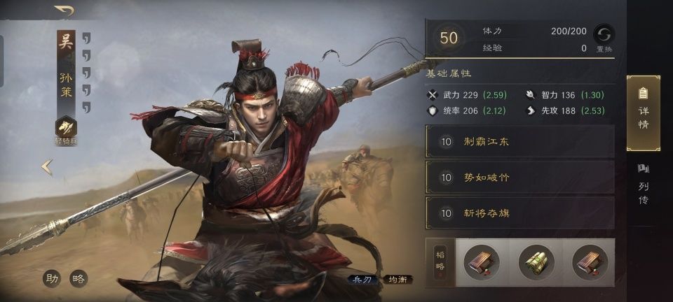 孙策战法:制霸江东+势如破竹+斩将夺旗。韬略库:强战善本+霸王传(专属)+得势善本。轻骑兵特性疾驰,专精点亮骁勇善战。在专精的增一下,孙策的制霸江东发动率被提升到了70%。和父亲一样,孙策也在这里掌握了断粮的能力。具体到这场战斗,是优先对敌方统率最低的徐庶下手。