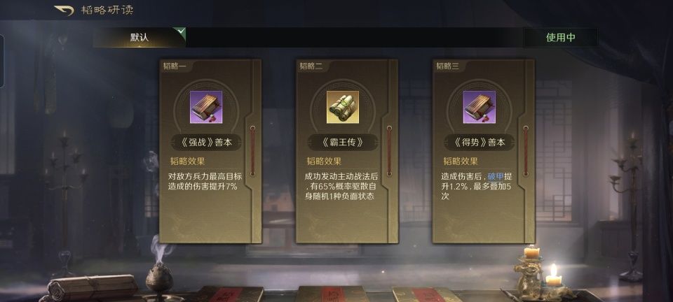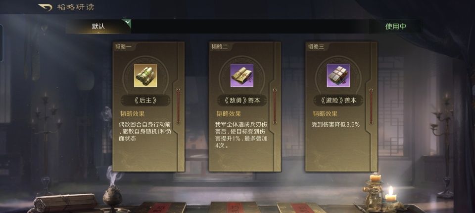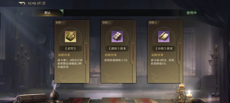 话本孙坚战法:江东虎威+横征暴敛+揭竿而起。韬略库:武烈(专属)+避险善本+兵情善本。重盾兵特性不屈,专精点亮屹然不动。只要普通攻击成功,无论统率点数是否高于对方,都可以降低对方100点统率并施加震慑,这确实比原版要香得多。同时,孙坚的自我诊疗、驱散和对敌断粮也都安排到位了,一切就看孙策的刀锋利与否。