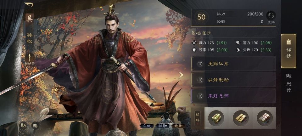 孙权战法:虎踞江东+以静制动+来好息师。韬略库:后主(专属)+敌勇善本+避险善本。长枪兵特性破敌,专精点亮愈战愈勇。为了给孙坚而外提升56%的连击率,孙权也是拼了,两个技能都是非主动。当然,孙权自己的连击率也一并提高,只是对于他来说并没有什么太大的用处。