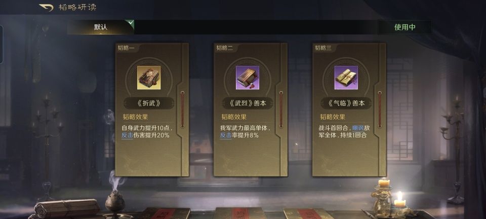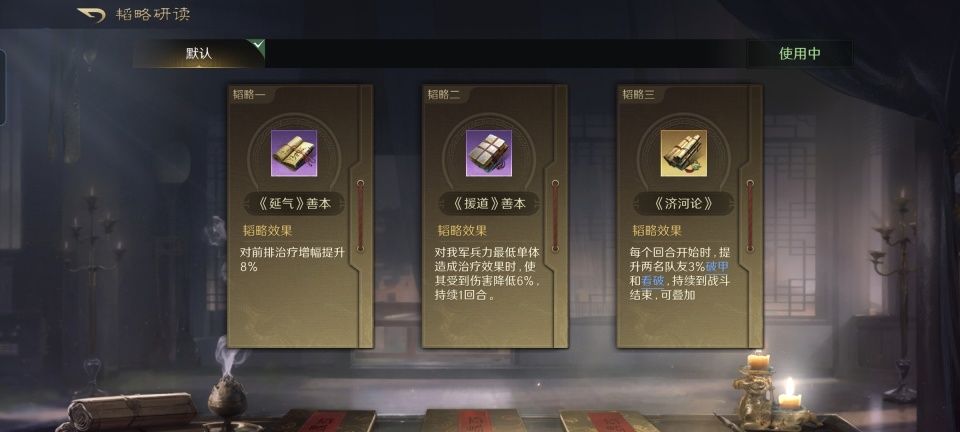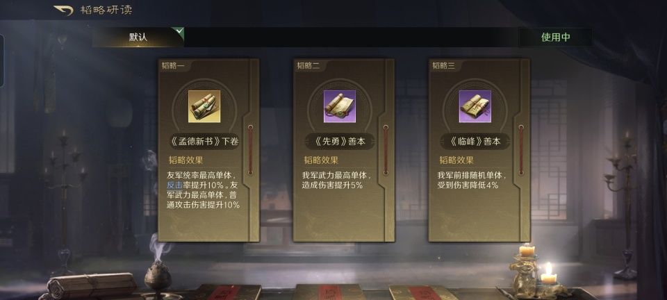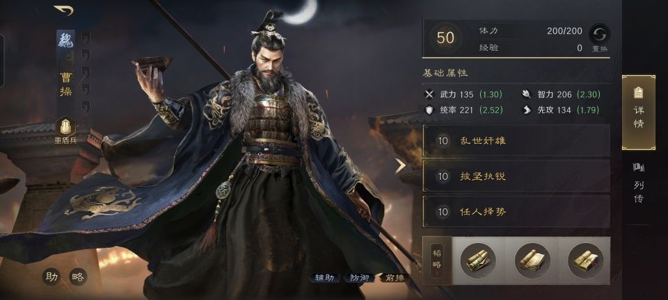 曹操战法:乱世奸雄+披坚执锐+任人择势。韬略库:孟德新书下卷(专属)+先勇善本+临峰善本。重盾兵特性不屈,专精点亮步步为营。身处锥形阵前排的典韦,同时吃到披坚执锐。此外,典韦还是这支队伍里统率和武力最高的友军,故而孟德新书下卷的反击率提升和普攻伤害提升也都通吃。