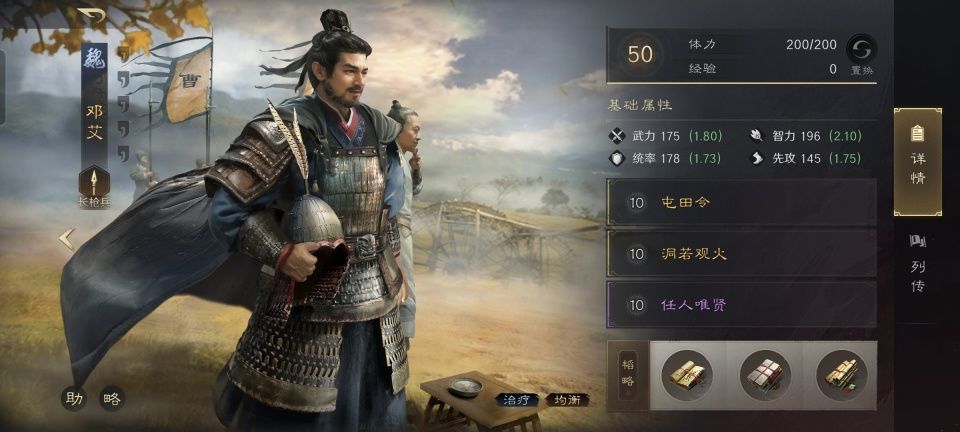 邓艾战法:屯田令+洞若观火+任人唯贤。韬略库:延气善本+援道善本+济河论(专属)。长枪兵特性破敌,专精点亮坚定不移。给典韦增加奶量还不算完,破甲、清醒、统率和伤害增益也都安排上了,邓艾的一切人设可以说就是围绕典韦而展开的。