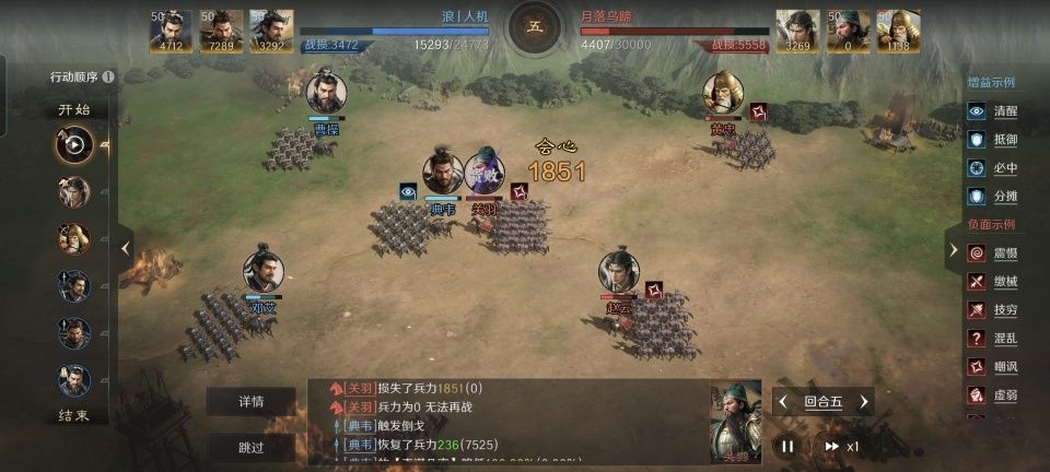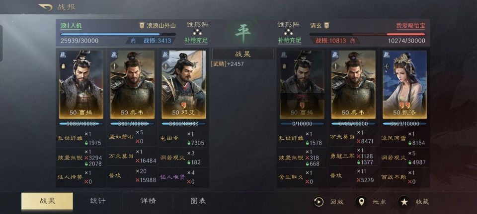 特别鸣谢游戏ID名为“浪丨人机”的玩家朋友,为本文提供了相当宝贵的创作素材,也是极为实用的战斗经验。他麾下的曹操、典韦和邓艾组成锥形阵,将对面的关羽、黄忠和赵云挨个引过来击杀,相关的战法搭配和周边部署,在下文的段落里会有详细的讲解。