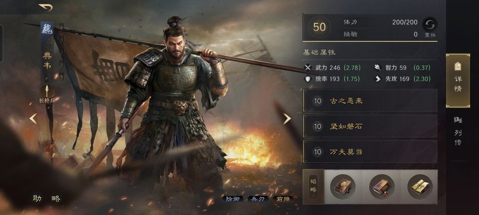 典韦战法:古之恶来+坚如磐石+万夫莫当。韬略库:折武(专属)+武烈善本+气临善本。长枪兵特性破敌,专精点亮兵锋益锐。值得注意的细节是,仅就武力值而言,典韦在三国谋定天下里是比关羽、赵云和黄忠都要高的。这就意味着,他无论普攻三人里的谁,都可以打出增伤后的传递伤害。