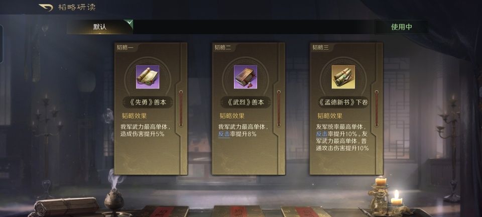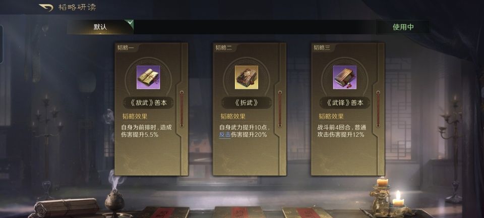 典韦战法:古之恶来+万夫莫当+勇冠三军。韬略库:敌武善本+折武(专属)+武锋善本。长枪兵特性破敌,专精点亮愈战愈勇。受到阵型的影响,前排的典韦获得了6%的减伤保护,好在几本兵书把他的火力略微拉起来了一点,尤其前四回合,普攻伤害总共可以提升17.5%。