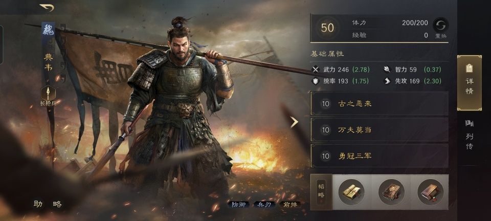 如此一来,阵型有保护,战法有叠加,即便没有披坚执锐,典韦也依旧是攻防兼备的。此法还是比较适用于拥有典韦,却没有披坚执锐的平民玩家。当然,最好还是玩原装的,这个可以作为权宜之计。#三国谋定天下