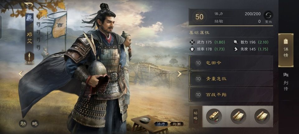 邓艾战法:屯田令+青囊急救+百战不殆。韬略库:济河论(专属)+先勇善本+兵令善本。长枪兵特性破敌,专精点亮枪阵严整。在具体的战法搭配上,邓艾可算是标准操作。不过兵书还是留了一手,不仅给典韦铺垫了破甲,还让武力值最高的典韦额外提升了5%的伤害。