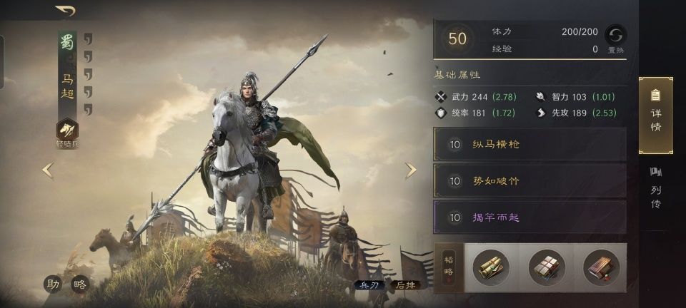 马超战法:纵马横枪+势如破竹+揭竿而起。韬略库:铁骑令(专属)+军争善本+王道善本。轻骑兵特性疾驰,专精点亮乘胜追击。
