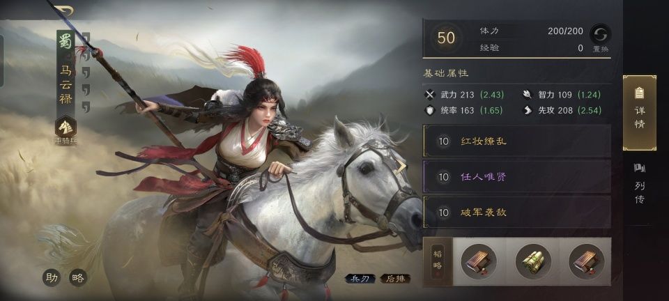 马云騄战法:红妆缭乱+任人唯贤+破军袭敌。韬略库:受势善本+风俗通义(专属)+作战善本。重骑兵特性坚韧,专精点亮纵马驰矛。把马家兄妹的特性结合到一起,可知马超总共获得了81%的会心几率。马云騄的会心几率虽然只提升了10%,却可以凭借红妆缭乱快速把畏惧buff施加给全部的敌人。