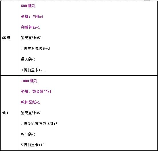 勇攀等级之巅,丰厚升级奖励等你来领。海量银贝、乾坤图纸、稀有坐骑:黄金战马、突破神石等,让你的战力飙升!