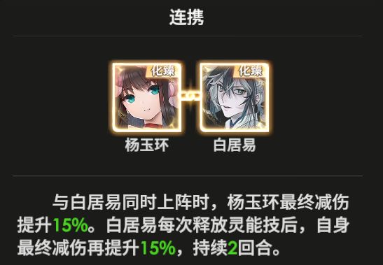 与白居易同时上阵时,杨玉环最终减伤提升15%。白居易每次释放灵能技后,自身最终减伤再提升15%,持续2回合。