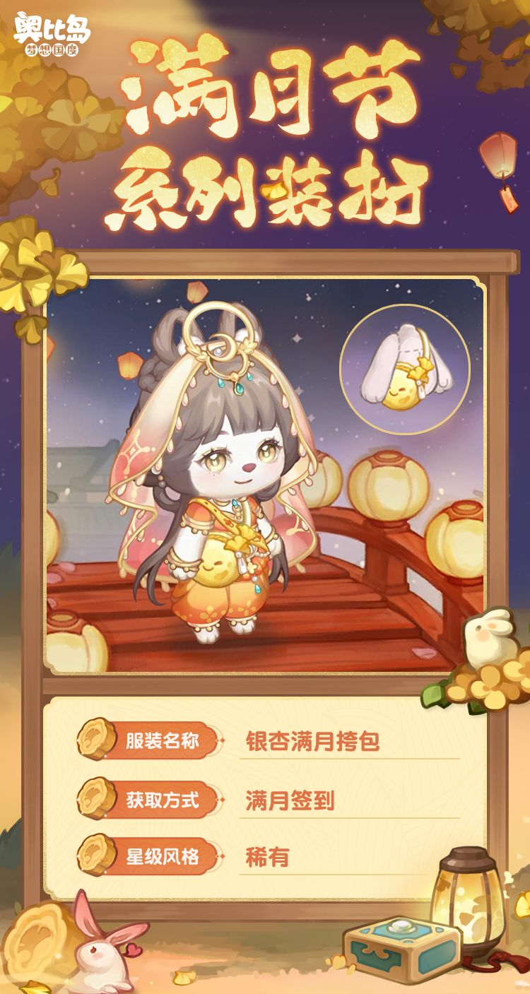活动期间,每日可前往奥比广场寻找薇丽塔领取节日礼物,累计7天还可领取满月节限定装扮「银杏满月挎包」!