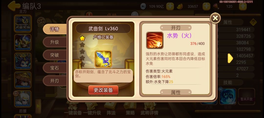 打法思路:开局冲方阵进场,三回合见朱雀,蔡文姬开技能曹植大水其余武将解阵(曹植控速全队最低),小朱雀进入三阶段时庞德大水带走变墓碑。然后朱雀40金身破除前不用换阵,金身破除后切换鹤翼阵,核心思路是朱雀弱点回合曹植释放技能前双七星水势辅助提前上debuff,理论最高水势增伤+150,我的配置能稳定17回合带走朱雀。道友能否一票就看自身曹植智力及侵蚀精通有无达标、水势数值是否足够了。最后祝大家早日一票朱雀。