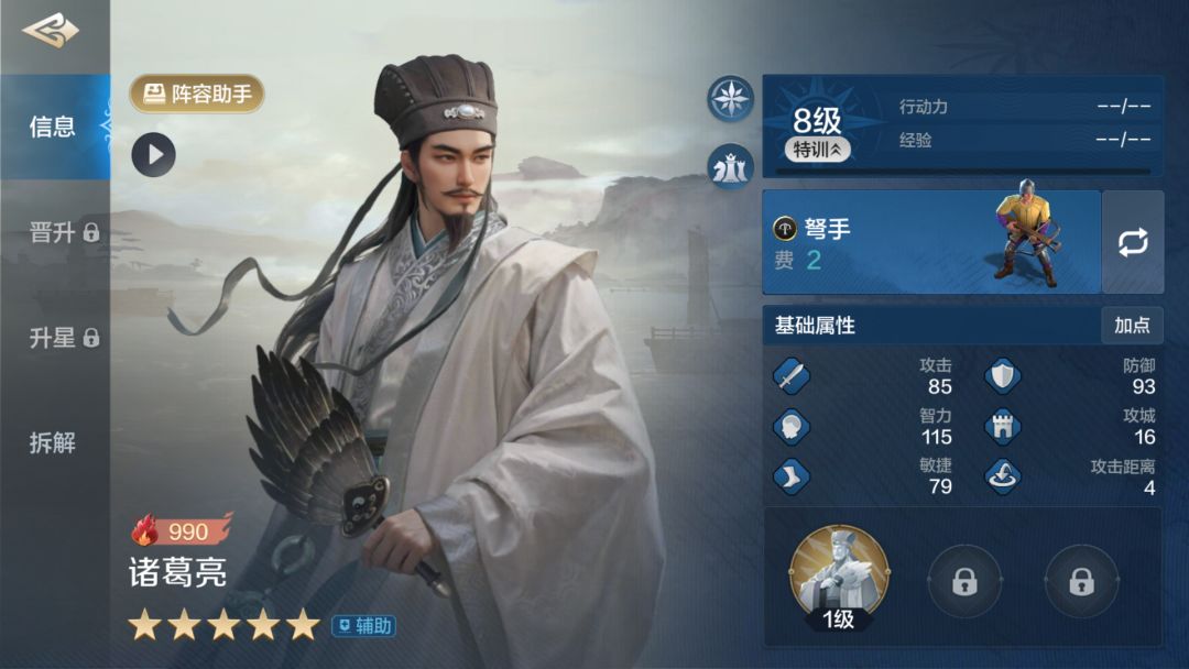 专属技能【千古人龙】满级效果:战斗开始后,每回合开始时,敌军全体智力属性降低(开场)10点,(受智力属性影响,该效果可叠加至战斗结束,无法驱散);奇数回合开始时对随机2名敌军施加失策状态(敌军每次成功发动主动技能时,50%几率打断使其无效)和徒劳状态(敌军每次成功发动追击技能时,30%几率打断使其无效),持续1回合,当失策和徒劳状态触发打断效果成功时,对目标额外造成1次智力伤害(伤害率150%,受智力属性和双方智力属性差值影响)。