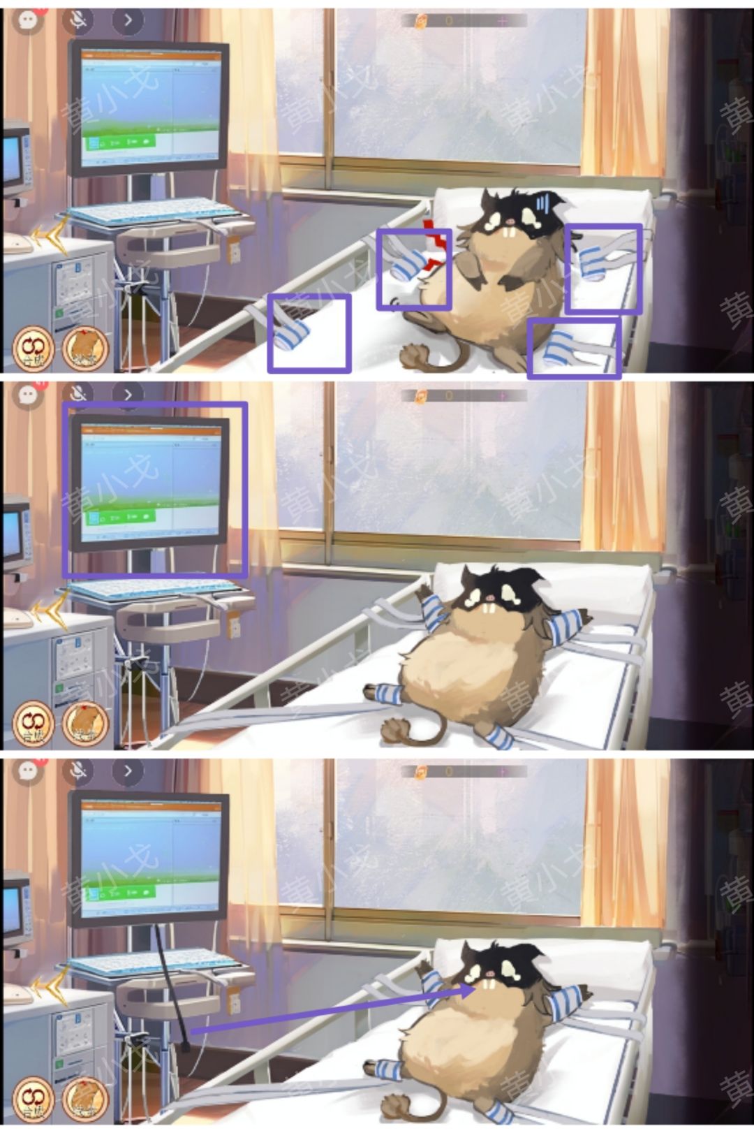 1.(病房)点击病床上四个角的束腹带将小猪鼠绑住;再点击胃镜仪器出现仪器管子;把仪器管子插入小猪鼠嘴巴