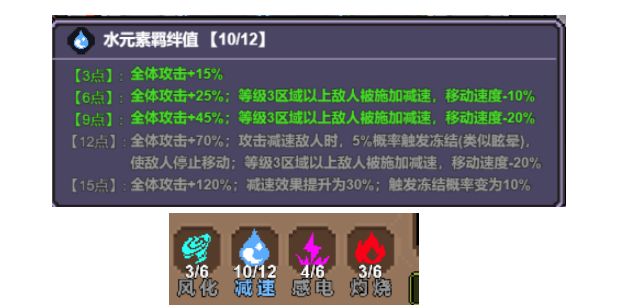 2、英雄会带有元素属性,s级英雄更是会有两种元素。元素可以在战斗中通过英雄升星与选择宝物累积,累积到一定值后会解锁强力效果,加速获胜。所以要在组建小队时有针对性地选择好上阵英雄的属性,以快速叠加羁绊值解锁机制