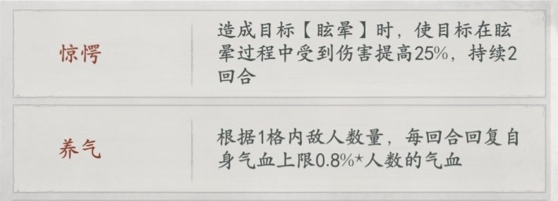 养气:根据1格内敌人数量,每回合回复自身气血上限0.8%*人数的气血