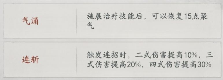 气涌:施展治疗技能后,(自身)可以恢复15点聚气