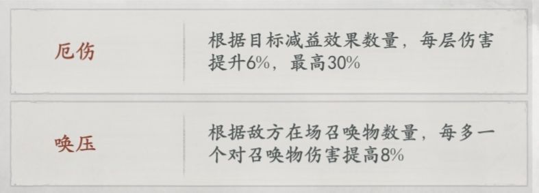 唤压:根据敌方在场召唤物数量,每多一个对召唤物伤害提高8%