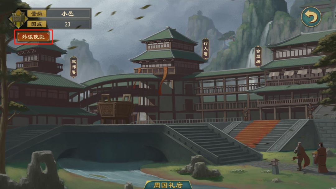 被他国置邸后,可以进行逐使操作解除“置邸”关系;成功置邸他国后,可以进行召回操作解除“置邸”关系。本次更新还在礼府内新增了外派使臣界面,可在该界面查看当前使者状态,并快速的进行置邸操作与召回操作。