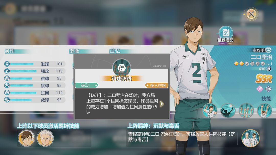 二口坚治能够直接提升队伍的拦网属性,依靠给敌人增加debuff来提升竞技强度。