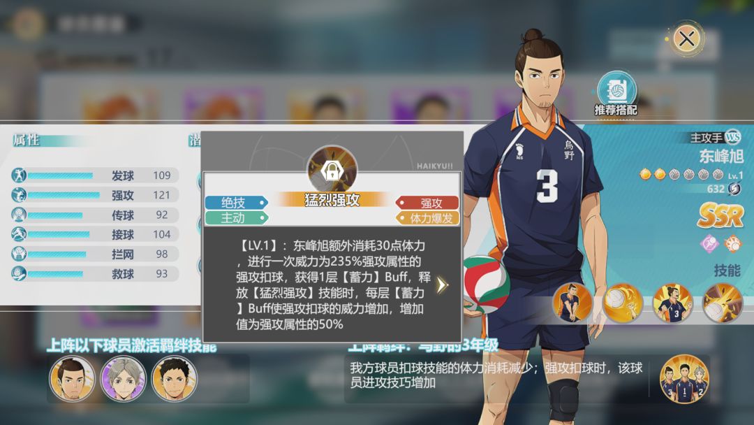 东峰旭是乌野队的主攻手,相较于田中龙之介而言,更加倾向于长时间输出,能够通过不断释放绝技提升输出。