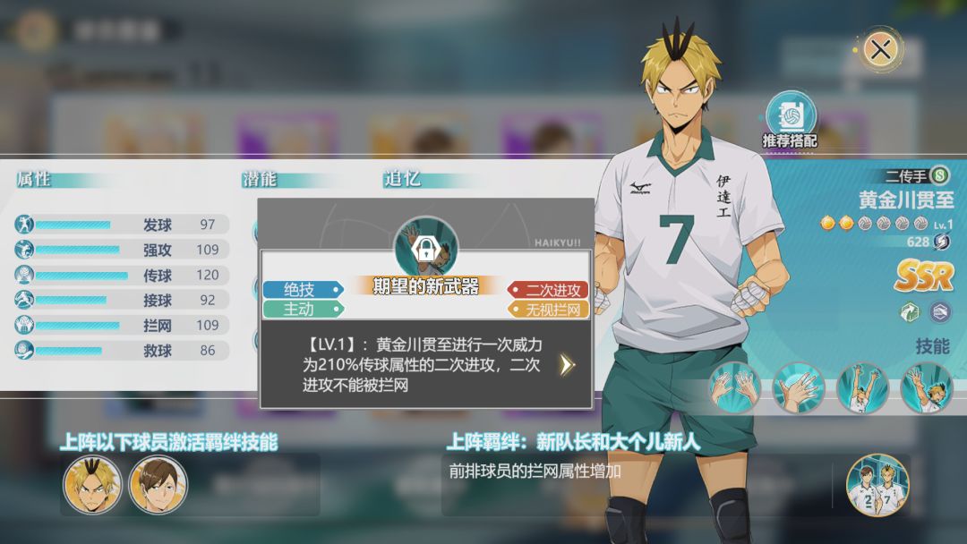 黄金川贯至是强大的拦网角色,自带提升拦网属性的光环,同时能够在对方扣球时增加队伍的拦网属性。