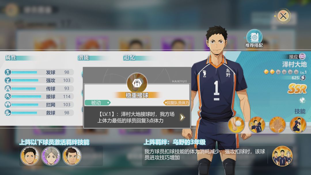 泽村大地能提升队友的进攻属性,并且能周期性恢复队友体力,是十分强力的角色,特别适合乌野队,在其他队伍也能上岗。