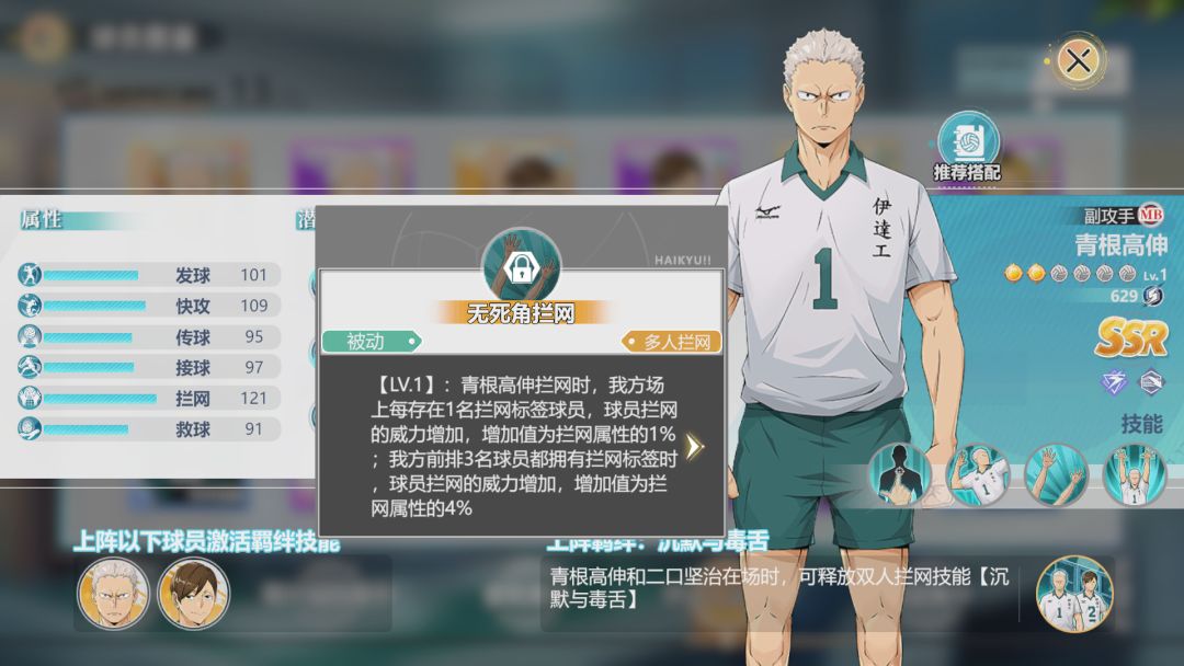 青根高伸虽然是副攻手,主要属性不是进攻,而是防御。他的技能、羁绊均是围绕拦网展开,能够周期性提升队伍的拦网属性。青根高伸需要比较完整的伊达工业队员,从而触发羁绊效果。