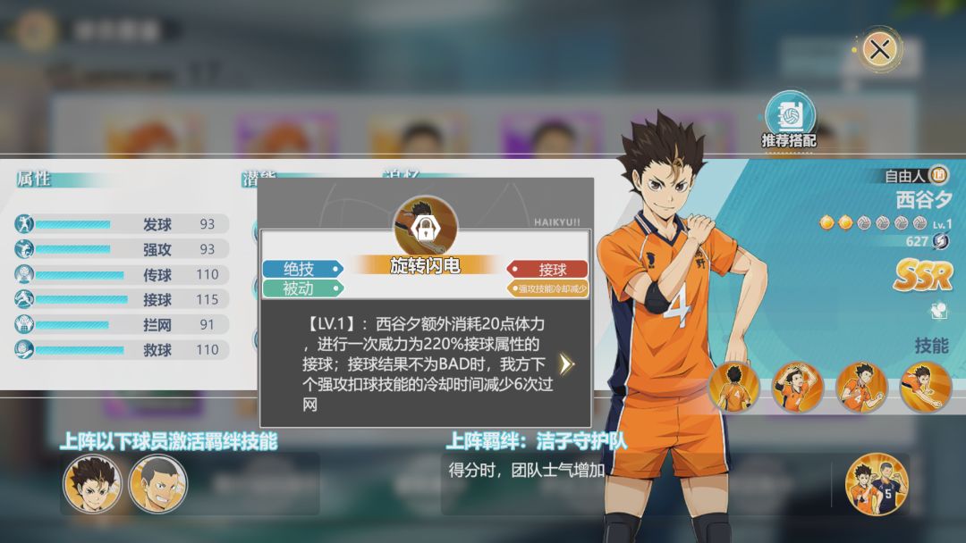 在游戏中,西谷夕凭借其优秀的救球、传球能力,能减少队伍失利的发生,同时增加队伍的进攻能力。