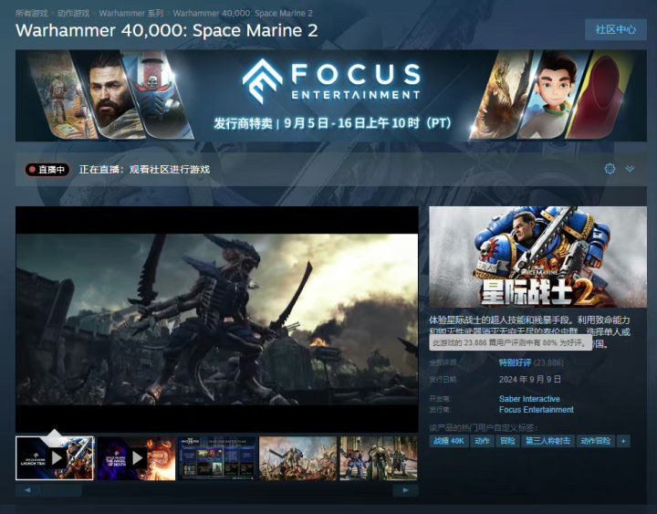Saber Interactive开发的第三人称射击游戏《战锤40K:星际战士2》已于今日正式发售,并在Steam平台上获得了“特别好评”。截至目前,游戏共收到23886个玩家评价,其中80%的玩家给予了好评。