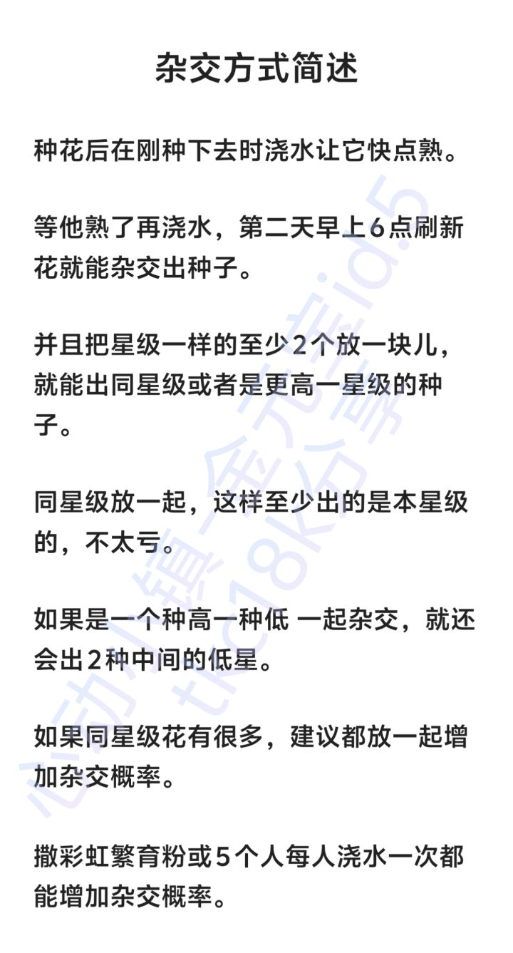 撒彩虹繁育粉或5个人每人浇水一次都能增加杂交概率。