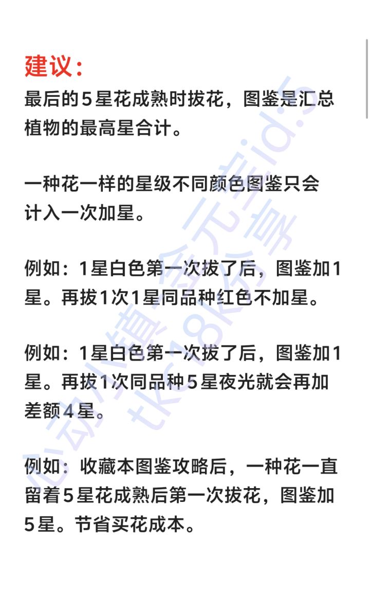 例如:收藏本图鉴攻略后,一种花一直留着5星花成熟后第一次拔花,图鉴加5星。节省买花成本。