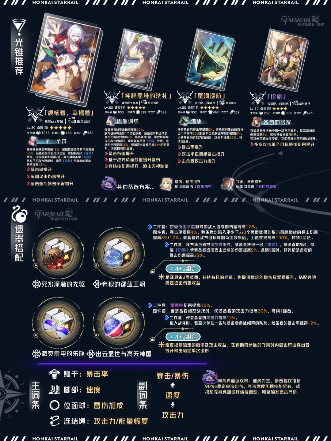 貊泽是一名雷属性-巡猎命途角色,通过指定敌方单体标记为【猎物】,触发自身及我方角色后续的行动收益,以快速收割【猎物】;
