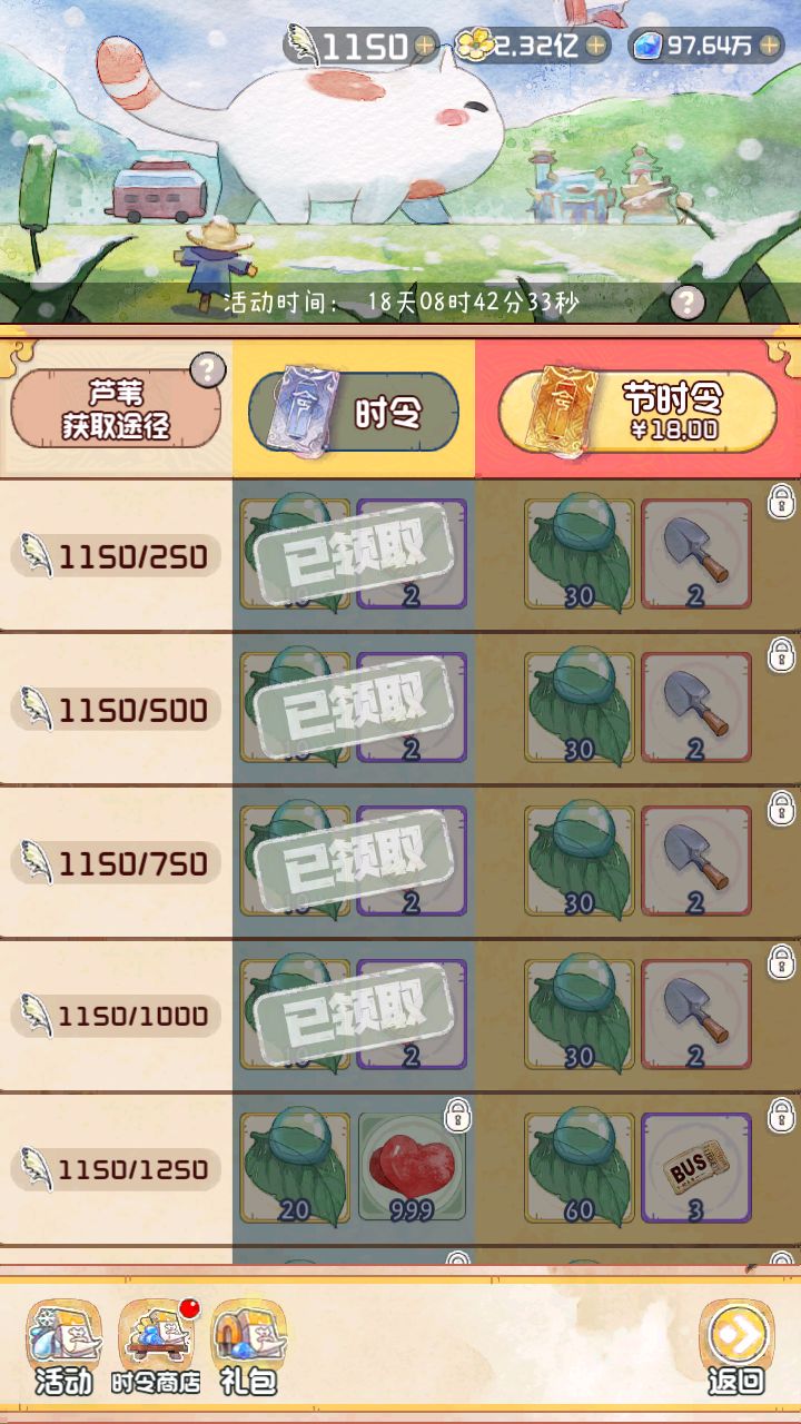 活动形式:与之前的时令活动类似,往期时令活动道具会自动转换为道具【露水】,往期时令活动文物也将加入兑换商店。
