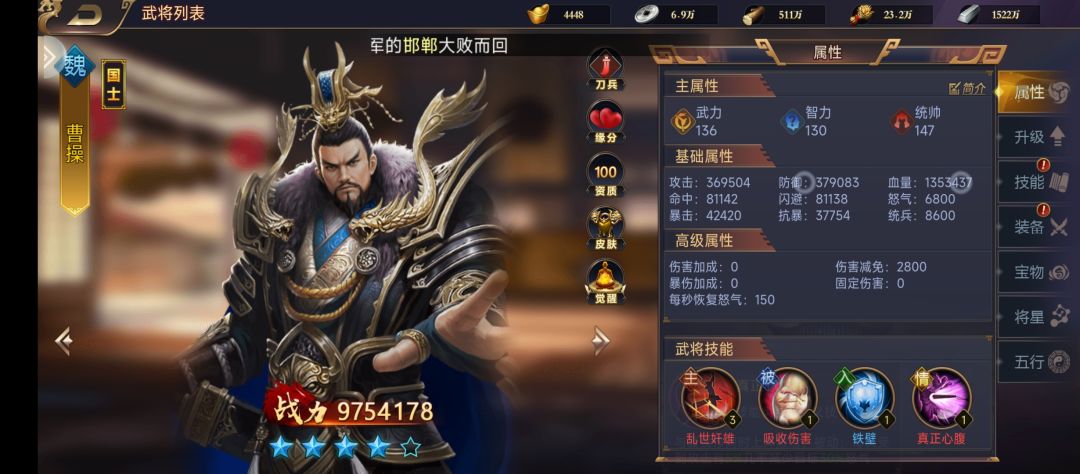 另外曹操和夏侯惇组队也可以组合情义技,前排好搭档,一个减怒一个加防。