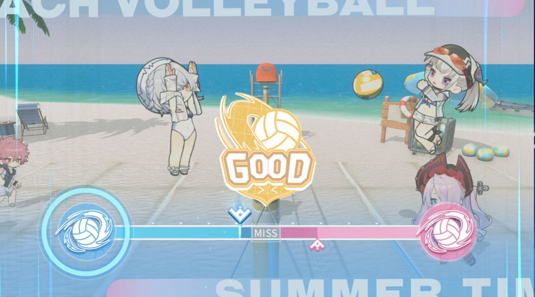当球到达网前时,双方队员同时起跳,进入争夺阶段。此阶段需要我们积攒己方能量条并在合适的时机点击,和对方进行能量比拼。我方能量在左边为蓝色,对方在右边为粉色,双方各自在己方能量条范围内积攒,双方谁的能量多谁就获胜。但要注意不要让能量条到达中间的miss区域,否则会比拼失败哦~