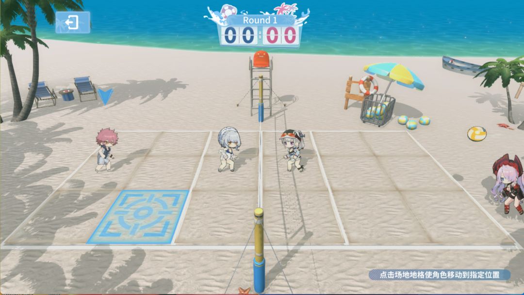 球在我方半场是,地上会出现蓝色图标,指示球接下来的落点。我们需要点击场地地板使得人物移动到图标所在的格子,接住排球。我方两个角色轮流接球,角色如果离目标格子过远可能接不到球哦~