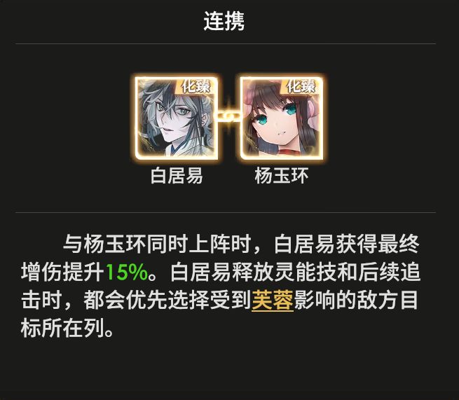 与杨玉环同时上阵时,白居易获得最终增伤提升15%。白居易释放灵能技和后续追击时,都会优先选择受到芙蓉影响的敌方目标所在列。