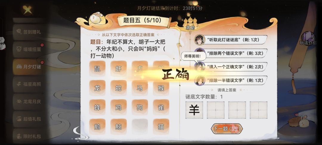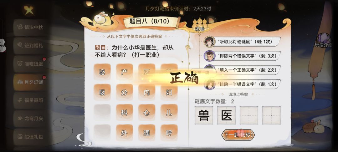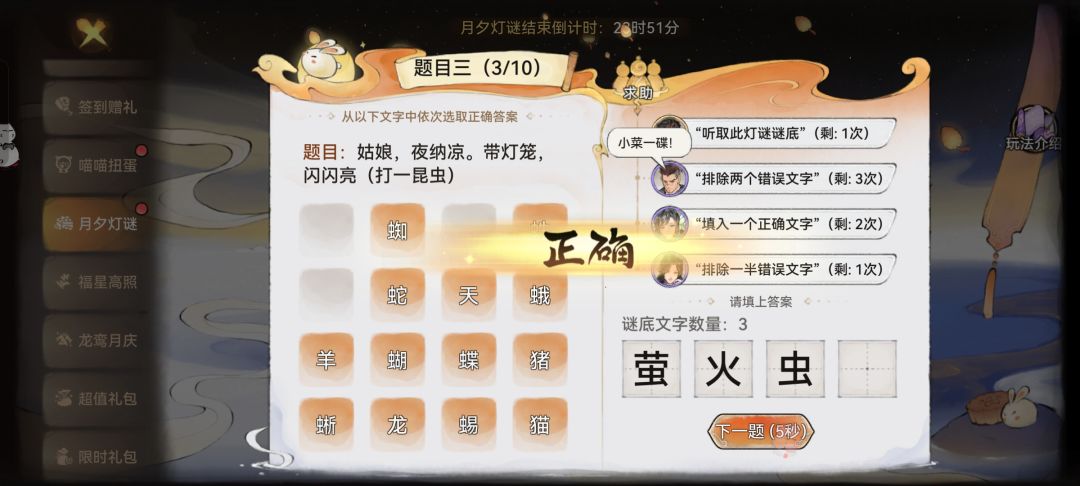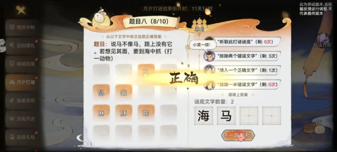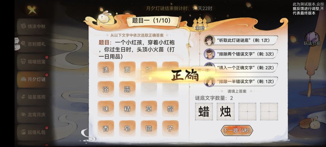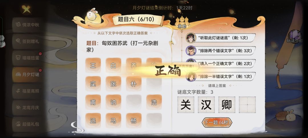 中秋活动持续七天,每天有十条灯谜,宝子们每条灯谜有1次听取灯谜、3次排除两个错误文字、2次填入一个正确文字和1次排除一半错误文字的机会。