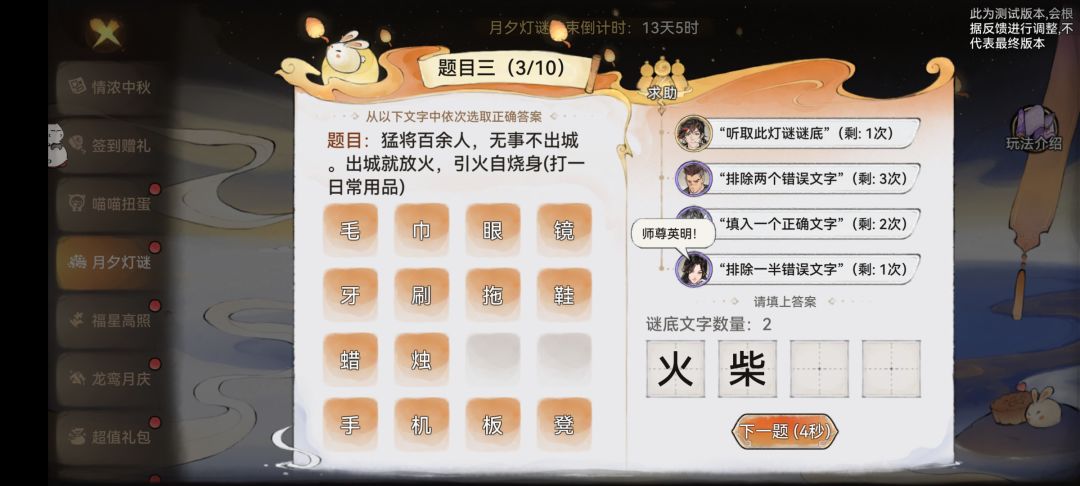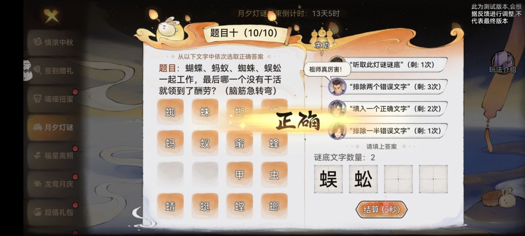 #最强祖师攻略 宝子们,痧哥有幸拿到了官方测试服资格,本期提前给大家分享一下中秋活动中的月夕灯谜玩法。