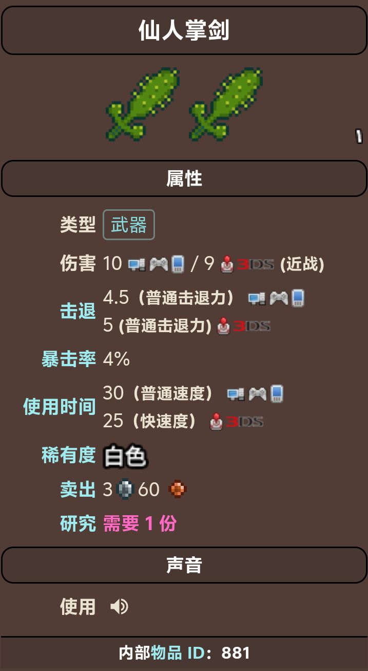 仙人掌剑由10个仙人掌在工作台附近制作,拥有比铜短剑更舒适的挥舞攻击和更大的攻击范围