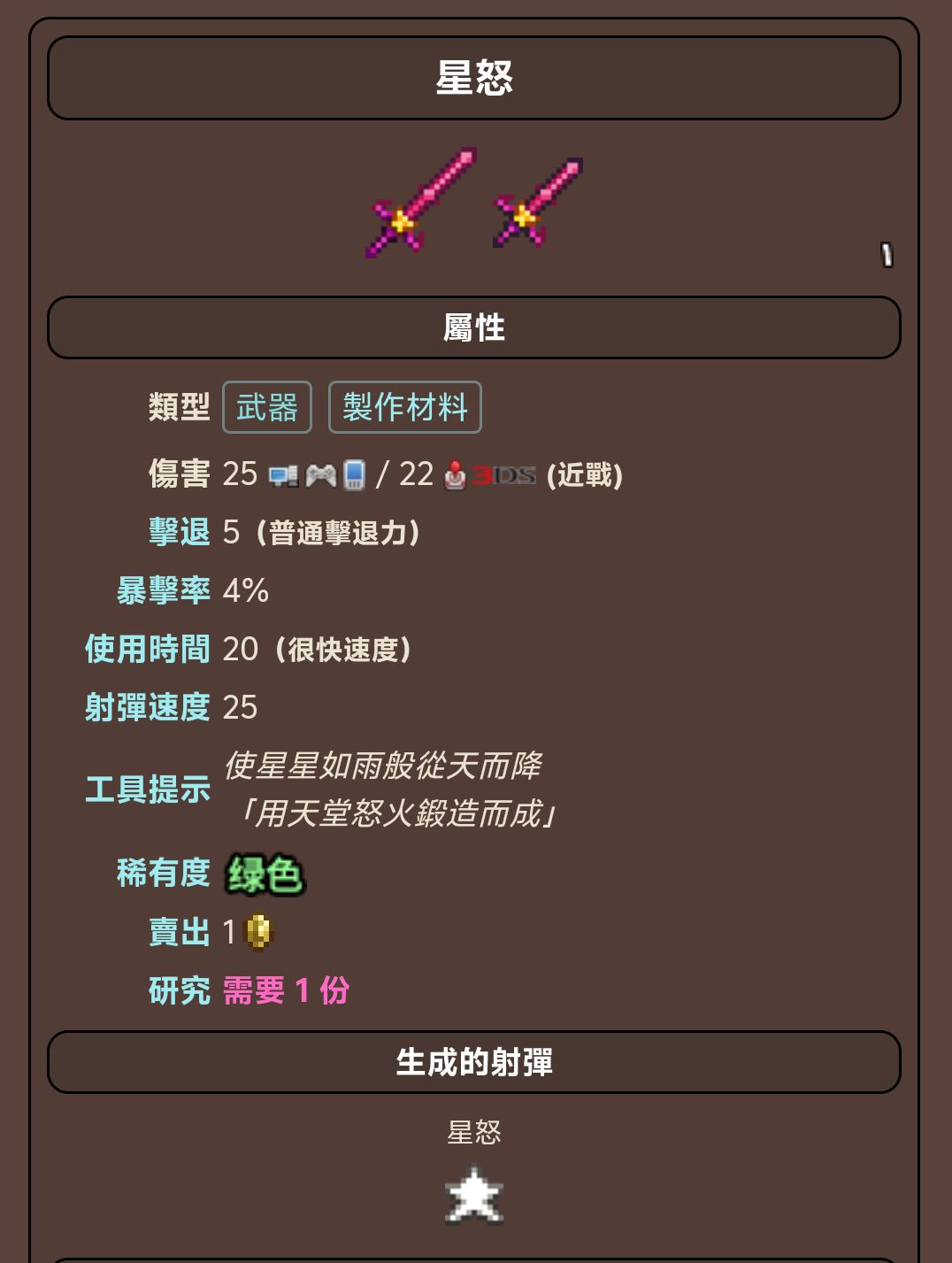 星怒在使用时会有一颗星星从天而降,落在光标的位置,造成1.5倍的剑的伤害,可以穿过实体墙,星星会发光,能照亮经过的地方