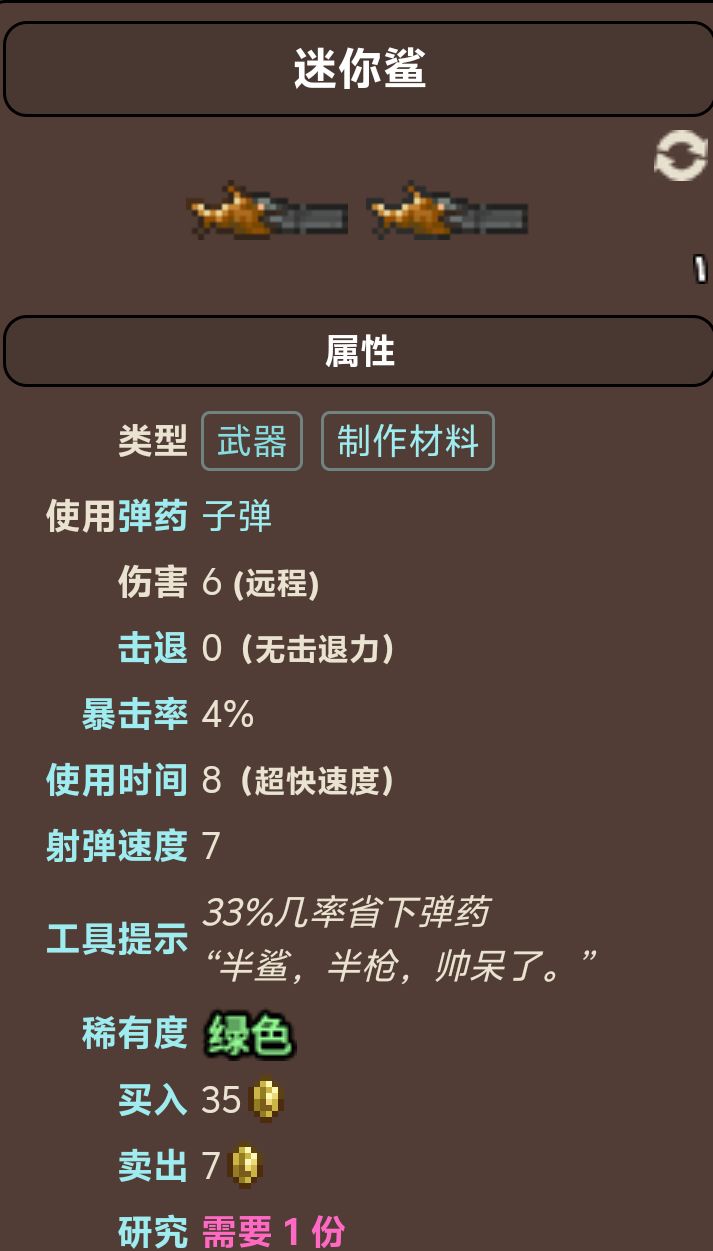 在拿到第一把枪后不久军火商就会入住,作为军火商,他有一把“大杀器”售卖,那就是迷你鲨,迷你鲨是一把典型的热门武器,极高的攻速让其拥有很好的手感。什么,你说没钱?多在血月钓几次鱼,这钱不就来了嘛~